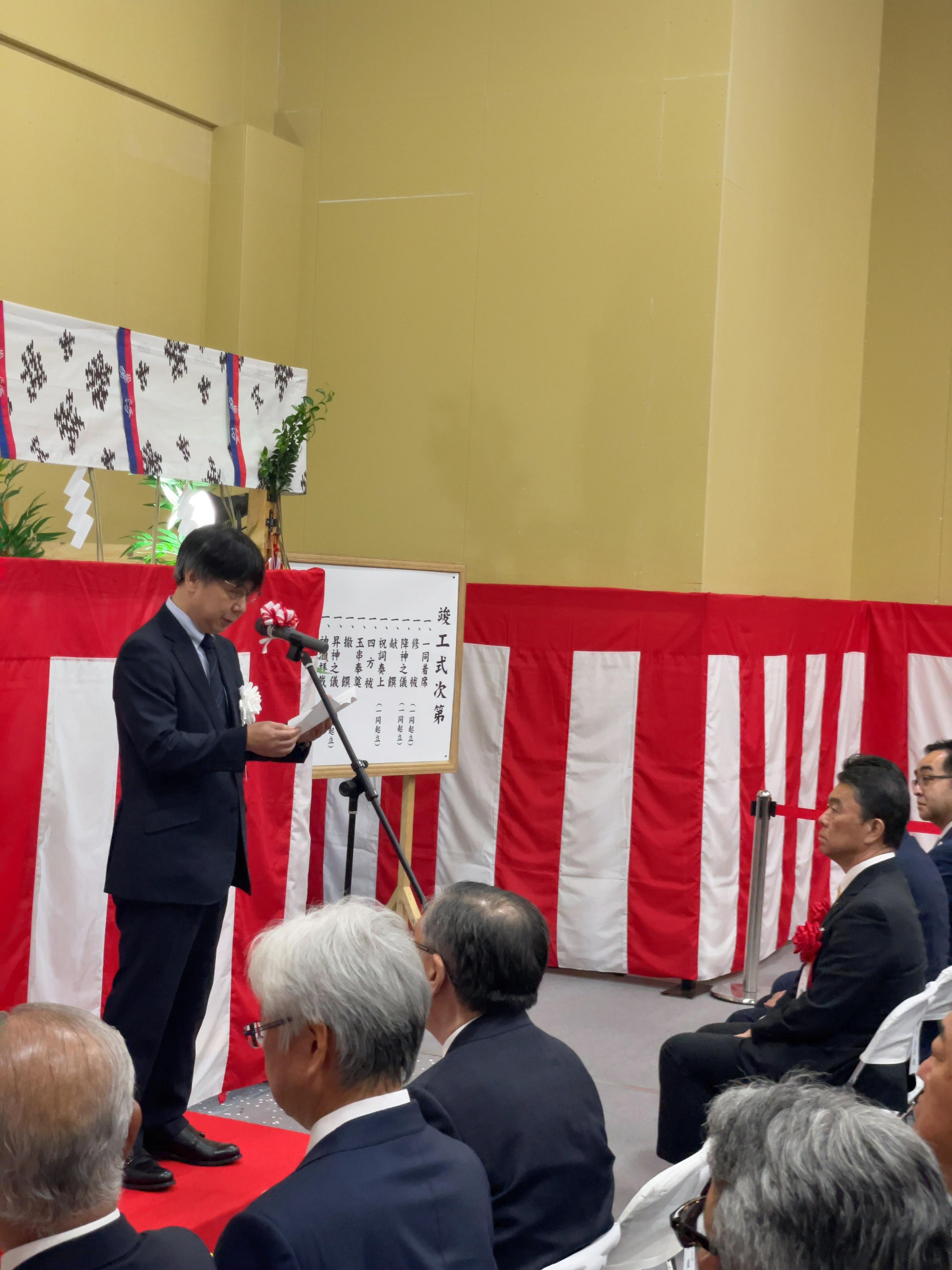 The completion ceremony was attended by Miyagi Prefecture Governor Murai Yoshihiro, Tomiya City Mayor Wakao Hirotoshi, METI Tohoku Bureau of Economy, Trade and Industry Director-General Satake Yoshinori, landowner and joint implementer of the Tomiya City Takayashiki Nishi Land Readjustment Project, Tohoku Broadcasting Co., Ltd. President Ichiriki Atsuhiko, and joint constructor Kahoku Land Co., Ltd. President Ito Naoki, in addition to JGC HD Chairman, President and CEO Sato and other construction personnel. Governor Murai and Director Satake gave words of congratulations and encouragement as guest speakers.