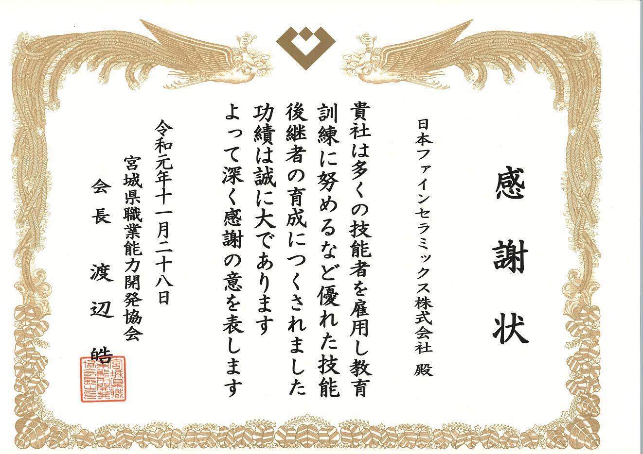 「宮城県職業能力開発協会」より「優良事業所」 として表彰を受けました 宮城県が運営している技能者を育成する「宮城県立仙台技術専門校」の修了生を、継続的に採用したことが評価され、「宮城県職業能力開発協会」より「優良事業所」として表彰を受けました。 表彰式は2019/11/28に宮城県庁にて執り行われました。